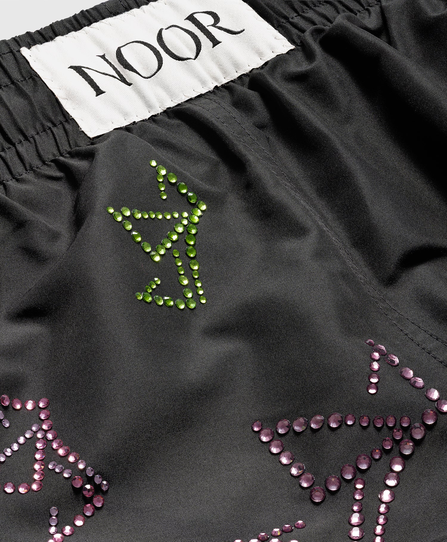 The End Style Crown Jet Swim Short with Crystals brings a bold reinterpretation of NOOR’s signature crown motif. Set against a black soft touch base, multicolored crystal strass glisten in lime, rose, silver and cyan to form a striking all-over pattern. Made in Italy, this limited-edition designer short for men combines relaxed ease with a luminous finish designed for statement moments by the water and beyond.